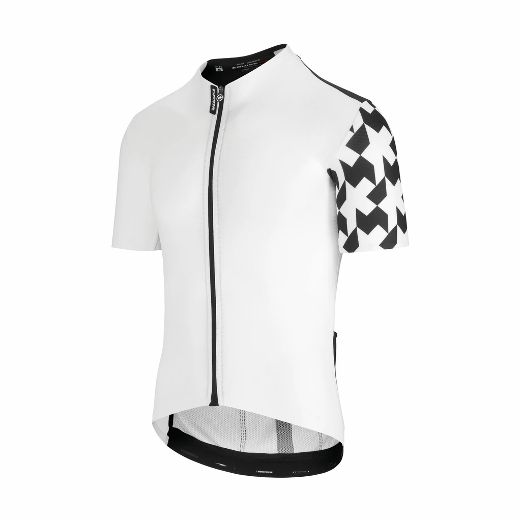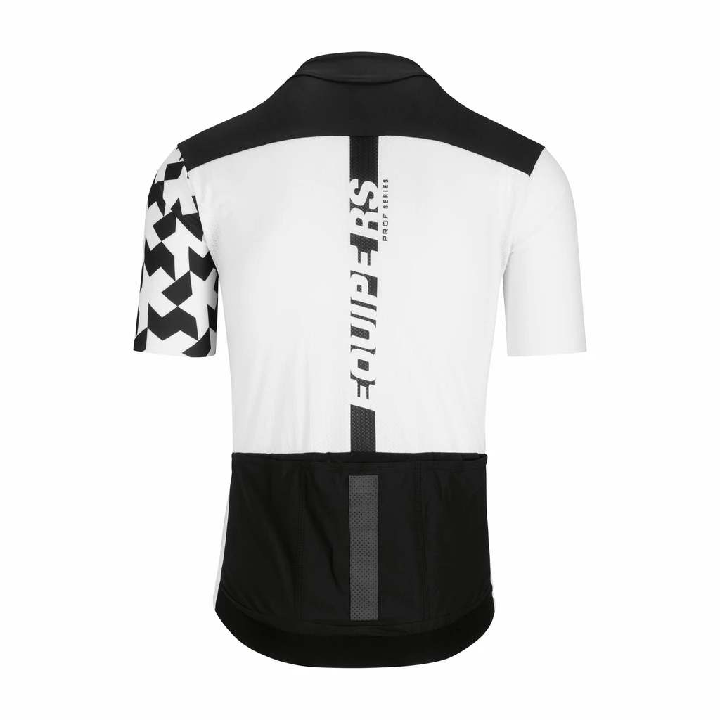 Le maillot à manches courtes pour homme ASSOS Equipe RS Aero SS Jersey, ici présenté en blanc, est conçu pour le cyclisme.