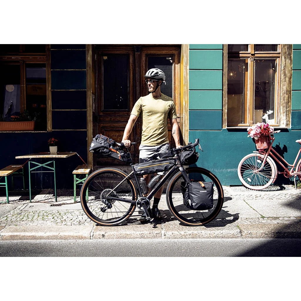 Accessoire indispensable pour toute sortie de bikepacking sur plusieurs jours, cette sacoche présente un volume variant entre 8 et 16,5 litres pour un poids de seulement 456 grammes. Elle est réglable et se comprime aisément grâce à une valve dédiée et une fermeture par enroulement très pratique. Munie de cordons de serrages élastiques, elle offre la possibilité de fourrer des vêtement à l’extérieur pour les conserver à portée de main.