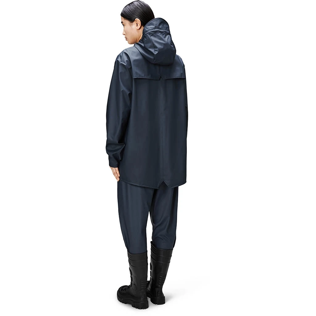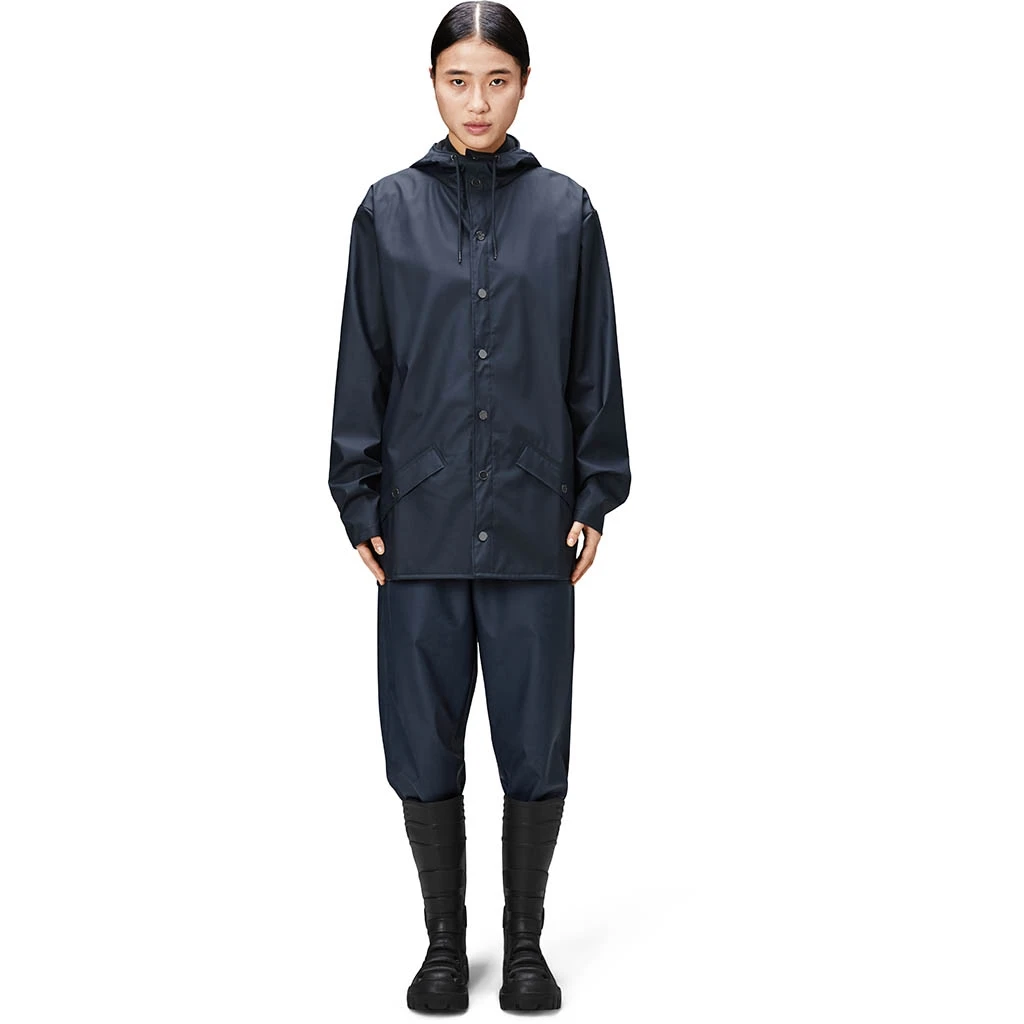 Cette veste se caractérise par des poches à rabat obliques doublement soudées, des poignets réglables et un ourlet en queue de poisson. Le look est complété par des boutons-pression, des œillets sous les bras et un empiècement arrière avec des aérations dissimulées. Elle est coupée dans le tissu PU emblématique de RAINS et présente des coutures soudées par ultrasons.